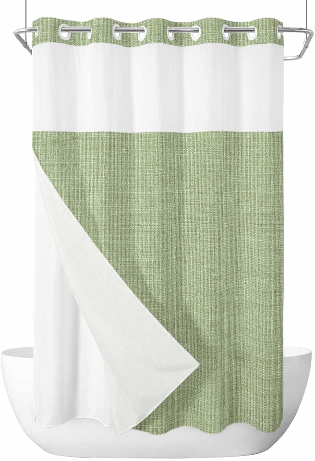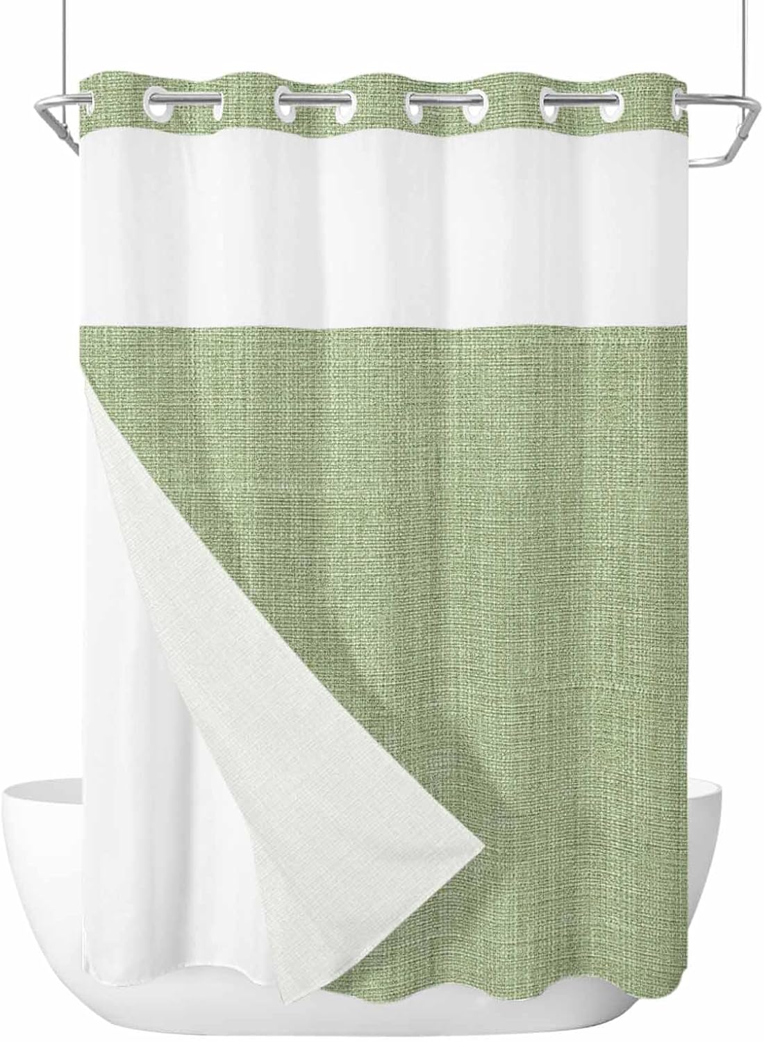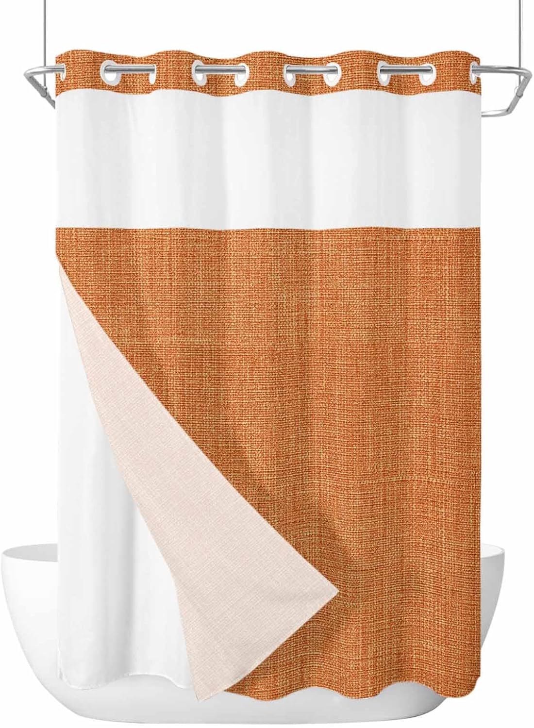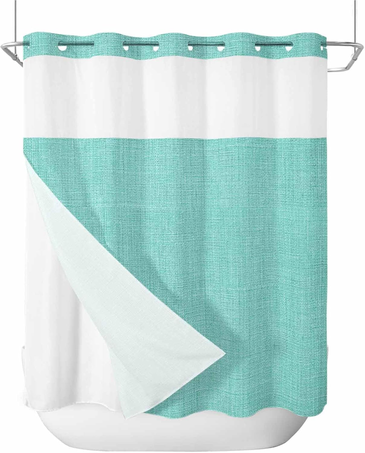 No Hook Shower Curtain with Snap in LinerDesign and AestheticsAesthetic colorful print artwork is original design by Edwiinsa, which is unique and with snap-in liner easily bring a luxury new look to your home, suitable for various home decor. The top window is a clever touch, allowing light to filter through and air to circulate, while maintaining privacy, creating a spa shower experience. It adds a nice, airy element to the space, making your shower feel less closed-off.Functionality and PracticalityThe no-hook feature is a game-changer—it’s so easy to install The built-in rings glide smoothly over the shower rod, and the curtain snaps in place without the hassle of traditional hooks. It's such a time-saver, and it looks much cleaner than dealing with a bunch of separate hooks. 2 magnets at bottom of the shower curtain to add extra weight and help keep this fabric shower curtain liner in place and billowing, bring you an wonderful shower experience.Quality and DurabilityThe shower curtain and liner are made with high quality fabric, feels sturdy and durability, soft to the touch. Both shower curtain and liner set are water-repellent, effectively preventing water splashes and keeping your bathroom floor dry.Ease of MaintenanceRemovable Inner Liner Design, maintaining this shower curtain set is a breeze. The snap-on fabric shower curtain liner is easily detachable for washing without taking the whole curtain down, keeping it clean and beautiful. The shower curtain and liner can be machine or hand-washed to keep it clean.